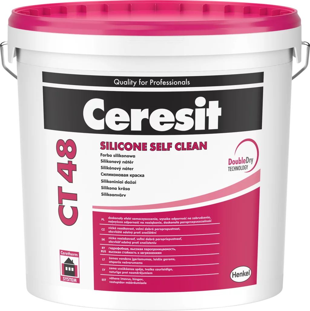 CERESIT CT 48 je silikonska, vodoodbojna i paropropusna boja namijenjena zaštiti fasada, betonskih struktura i enterijera. Može se nanijeti na mineralne podloge (beton, cement, malteri, krečno-cementni malteri i krečni malteri). Struktura premaza obezbeđuje brzo isparavanje vlage iz podloge.