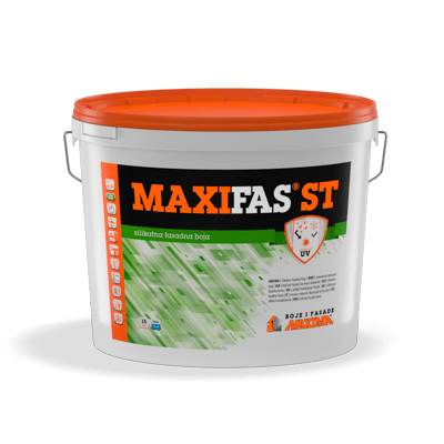 MAXIFAS ST je visoko kvalitetna fasadna boja, na bazi kalijumovog stakla, akrilnih i silikonskih veziva. Alkalno otporna, ima izuzetnu paropropusnost, dobru vodoodbojnost, otpornost na prljanje, atmosferske uticaje i UV zračenje. Upotrebljava se za zaštitu i dekoraciju spoljašnjih i unutrašnjih mineralnih površina. Zbog svojih izuzetnih karakteristika, preporučuje se za restauraciju starih građevina. Proizvodi se kao bijela, a može se i tonirati na MAXIMIX sistemu, u nijansama sa oznakom ST.