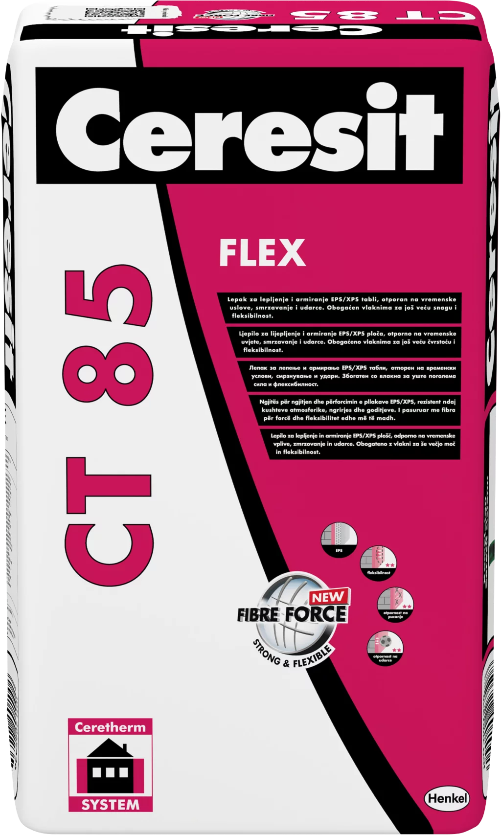 CERESIT CT 85 je fleksibilan lijepak za lijepljenje i izradu rabicirajućeg sloja u okviru Ceresit Ceretherm sistema. Koristi se za nove zidane objekte kao i za postojeće objekte koji treba da budu termoizolovani. Zahvaljujući Fibre Force vlaknima povećava otpornost izolacionog sistema na oštećenja i nastanak pukotina. Dostupno pakovanje: Džak od 25 kg.